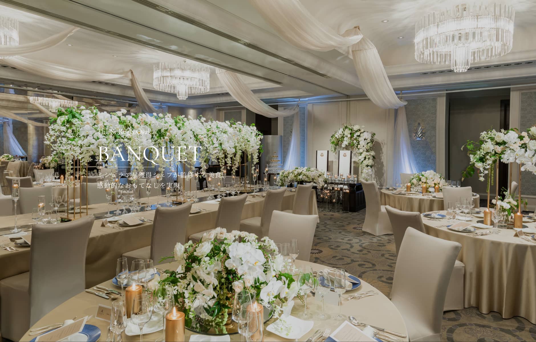 ゲストの五感を満たす、格式高いおもてなしと至福の美食。 豪華なシャンデリアが輝くボールルームから、邸宅のようなプライベート空間まで、多彩な会場をご用意。